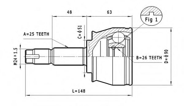 Внешнее зацепление со стороны колеса : 25Внутренне зубчатое соединение со стороны колеса : 26Диаметр прокладки [мм] : 51Диаметр шарнира [мм] : 91Длина [мм] : 148,73Размер резьбы : M24x1.5Сторона установки : со стороны колеса Показать больше свойств