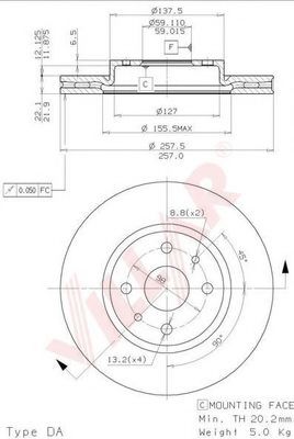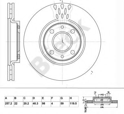Тормозной диск Диаметр [мм] : 257,5 Диаметр ступицы колеса [мм] : 59 Количество отверстий : 4 Минимальная толщина [мм] : 20,2 Тип тормозного диска : с внутренней вентиляцией Толщина тормозного диска (мм) : 22 Показать больше свойств